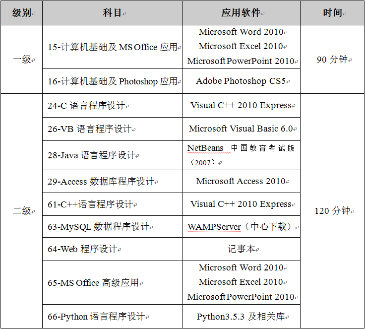 NCRE各科目考试软件列表