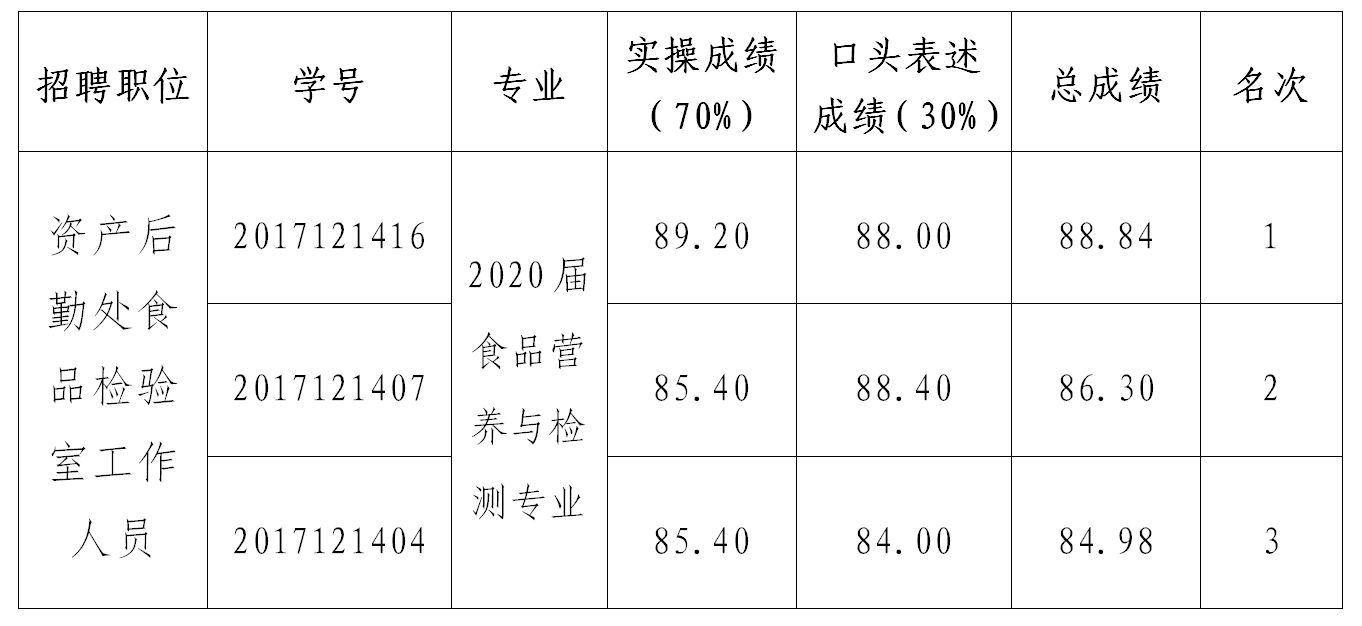 2020年招聘招聘资产后勤处食品检验室工作人员综合面试成绩汇总表