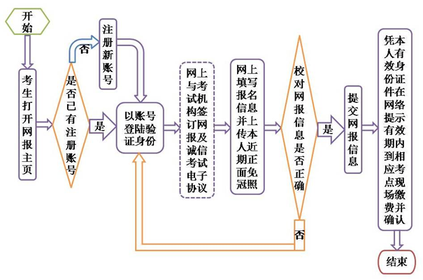 1.考生须在规定时间上网报名,单次考试每名考生最多可报3个科目,级别不限。严禁考生单次考试重复报考同一科目,否则将按照违规处理。网上报名操作方法详见附件1:《全国计算机等级考试考生使用说明书》。考生网上填报流程如下: