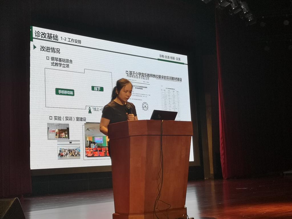 首先是学院的十个专业主任上台讲述分享本专业的诊断和改进等工作,他们主要围绕专业定位、师资队伍、学生规模、实训条件和专业建设等方面展开阐述,如学前教育的廖佳仪主任讲到本专业的人才培养目标分析,在往后五年工作愿景,争取将学期教育专业上升为校级品牌专业,继续发展多元化的人才培养模式,并将重心放在教学质量和科研发展上,在每一项工作都打上分。此外,专业主任们还讲到本专业存在的问题,如师资队伍、科研申报、专业教师信息化能力等方面有待于提升,其改进措施是,加大课程建设和教师信息化培训力度,鼓励教师多参与社会实践,全方位深入开展校企合作、校校合作、实现共赢,服务区域教育。