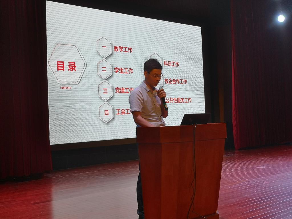 接着,王方副院长上去点评了各专业的诊断改进报告,肯定了专业的发展和诊断报告,同时也建议专业主任利用暑假时间好好梳理一下本专业的诊断报告,下学期还要进行更具体更有实效性和可行性的诊断分享。随后,学院团支部书记张超解读了《星空在线(中国)唯一官方网站教职工因私出国(境)管理暂行规定》文件,告知教职工们出国(境)需要走正规的程序,须高度重视意识形态方面内容。紧接着是杜伟祥院长从教学常规活动、教师和学生赛事、学生工作、党建工作以及工会工作等方面对学院的总结,肯定了本学期学院的赛事成果,如全国职业院校技能大赛李默尘老师指导的动漫制作荣获一等奖、广东省第十届大学生体育运动会战果累累,服装设计专业高晓杰、黄秀丽、胡叶娟老师指导的《基于新疆北疆地区少数民族服饰现代化创新设计与产品研发》荣获特等奖、《基于墩头蓝客家服饰文化特色的旅游纺织品创新设计》荣获二等奖等。在校企合作方面,本学期校企、校政合作方面共计完成9项,其中环艺专业与河源市铭信建设工程有限公司合作的现代学徒制校企合作已进入实际操作阶段,成果显著。