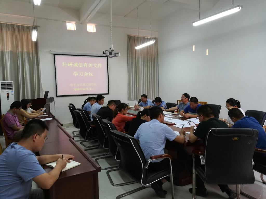 为加强我院教职工科研诚信意识,健全学校科研诚信管理体系,电子与信息工程学院于2019年10月14日下午在学院会议室召开了电信学院科研诚信管理文件学习会,出席会议的有学院领导班子、全体专业主任、行政管理人员,会议由学院王富宽院长主持。