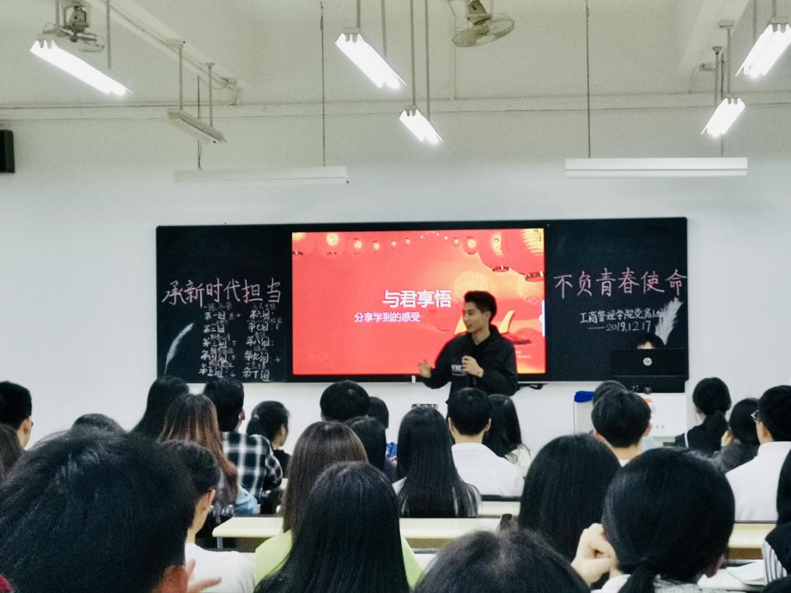 为进一步让当代大学生了解当代青年的使命与担当,使他们能在思想与行为上入党,始终在思想上、行动上与党中央保持高度一致,12月17日,工商管理学院学生党支部以“承新时代担当,不负青春使命”为主题在教学楼C103举办党日活动。学生党支部成员、学生干部及入党积极分子参加了此次活动。活动由钟丽娜、唐胜静主持,在“声情并茂”的环节中拉开序幕,各小组通过观看纪录片《自强不息》并上台进行绘声绘色的配音,以生动形象的汇演剧情传达了自己的使命与担当。