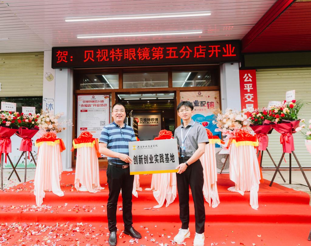 贝视特眼镜是我校校友创办的企业,在我校众创空间设立了培育基地,袁锦文同学就是在学校的培育基地经过半年的培训考核合格后,担任第五分店店长职位,并拥有第五分店的股份。