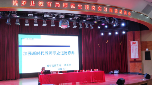 为提高新顶岗实习学生的专业知识及教育教学水平,使师范类实习学生能尽快地熟悉岗位工作,尽快成为一名合格的教师,3月1日上午,博罗县教育局在星空在线(中国)唯一官方网站艺术楼演播厅开展顶岗实习学生岗前教育培训。