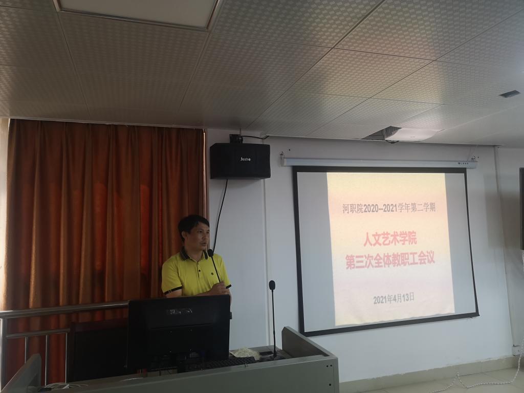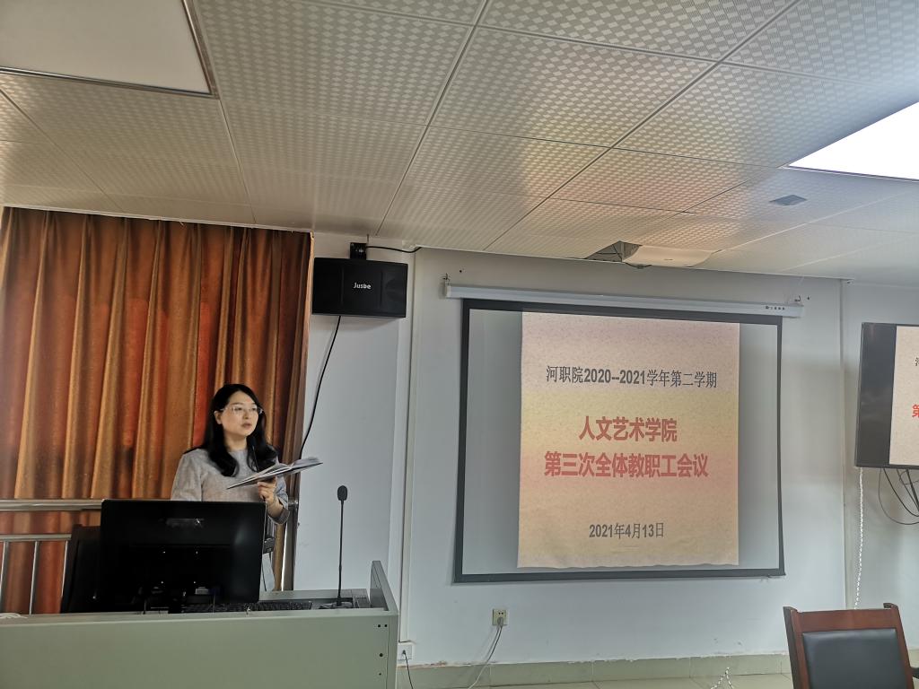 4月13日下午15:00,人文艺术学院在行政楼B601召开了本学期第三次全体教职工会议,此次会议的主题是教科研工作布置及科研工作管理文件学习,学院全体教职工参加了此次会议。