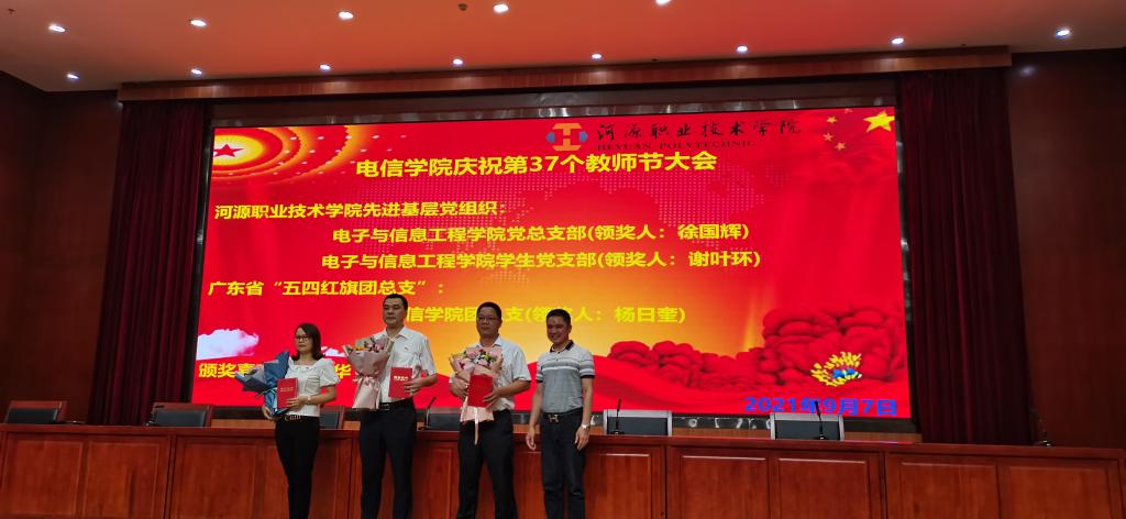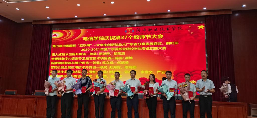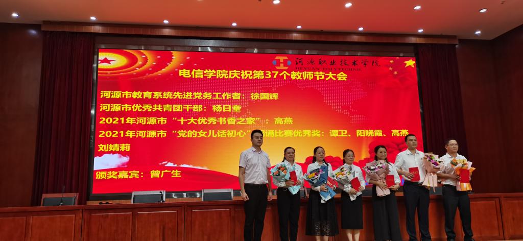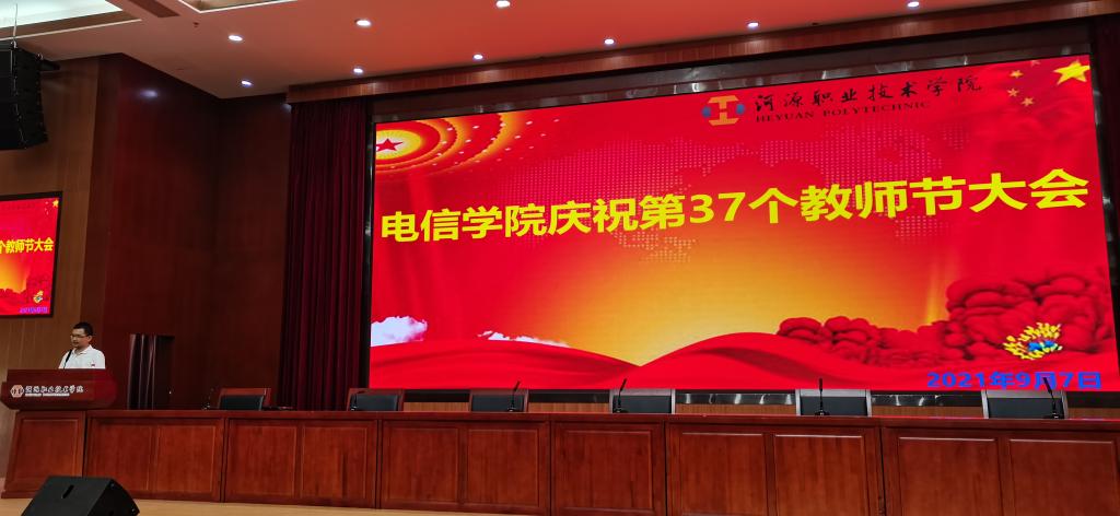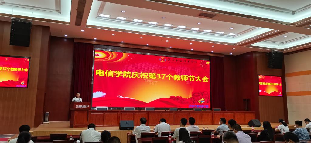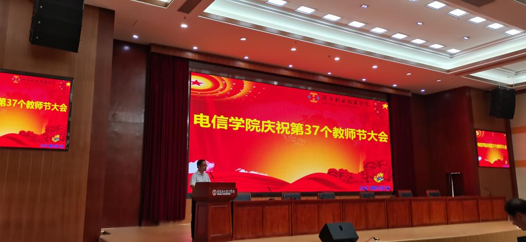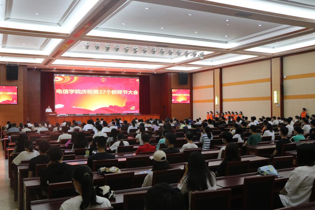 赓续百年初心,担当育人使命。以庆祝教师节活动为契机,深入学习贯彻习近平总书记在庆祝中国共产党成立100周年大会上重要讲话精神,系统展示我院在教育教学方面取得的丰硕成果,集中展示广大教师爱党爱国、仁爱奉献的精神风貌,为团结凝聚广大教师更好担负起立德树人根本任务,向全面建成社会主义现代化强国的第二个百年奋斗目标迈进提供坚强的政治保障和组织保障。2021年9月7日,我院在学术交流中心报告厅隆重举行第37个教师节庆祝大会。袁光华副校长、行政处室代表:欧阳玉娟处长、戴佰阳处长、曾广生副处长、周文副馆长、蔡鹏副主任,电信学院全体教职工及学生代表参加了会议,会议由学院党(总)支部书记王富宽院长主持。