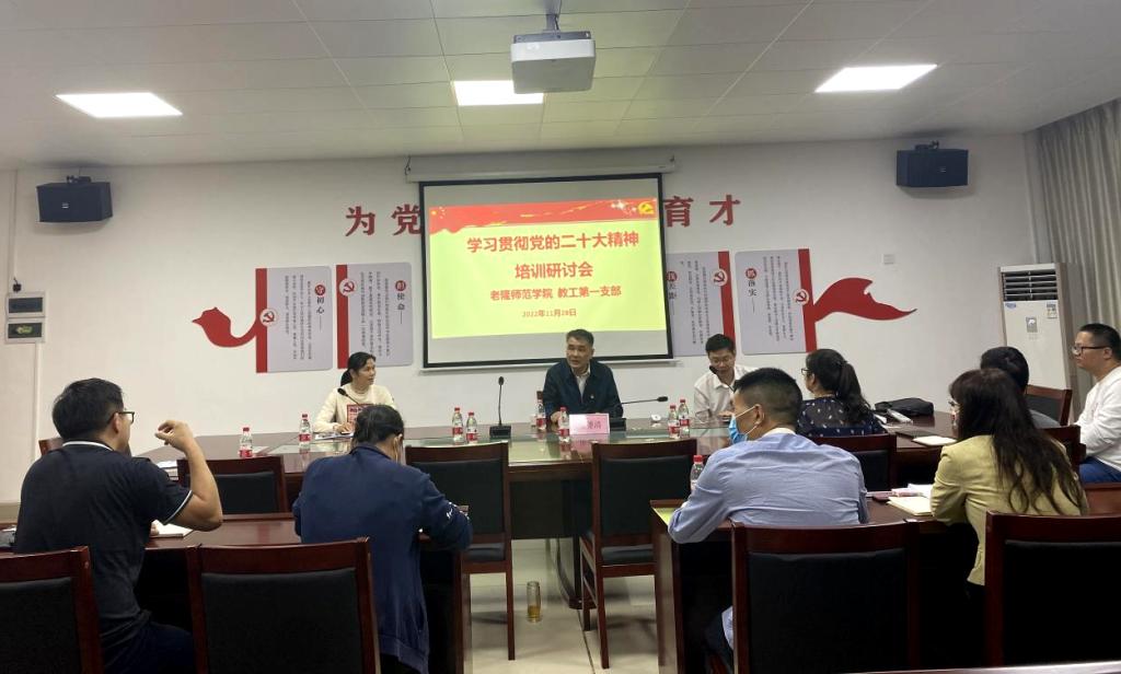 11月28日下午,老隆师范学院教工第一党支部在艺术楼A201会议室开展学习贯彻党的二十大精神培训研讨会活动。陈德清校长主讲,教工第一党支部全体党员参加。