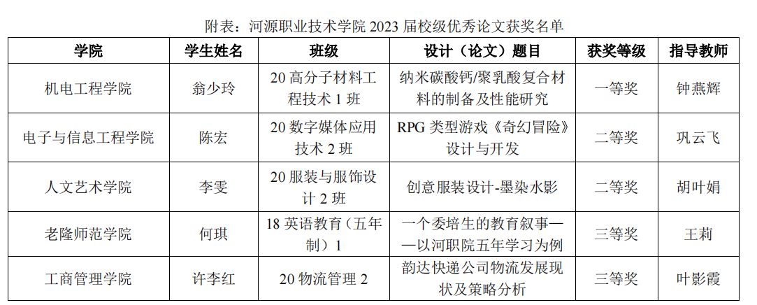 615日下午,我校在教学楼开展2023届校级优秀毕业论文公开答辩工作。此次评审分为二级学院初评和学校现场评审两个环节,整个评审过程公开、公平、公正,共评出校级优秀论文5篇,其中一等奖1名、二、三等奖各2名(具体见附表)。参加现场评审的有校级评委、各二级学院副院长、指导教师代表、21级学生代表和教务处相关人员。