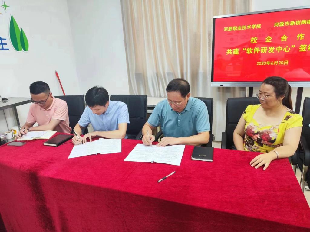 2023年6月20日下午,电子与信息工程学院和河源市新锐网络科技有限公司在实训楼A303举行校企合作联合共建“软件研发中心”签约仪式。河源市新锐网络科技有限公司黄新源经理、胡桥波技术总监以及电子与信息工程学院王富宽院长、相关专业教师及学生代表出席了本次签约仪式。