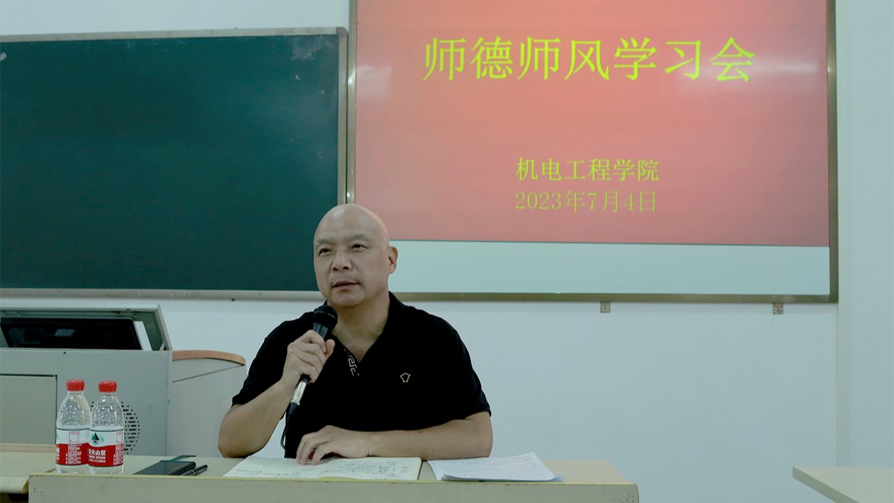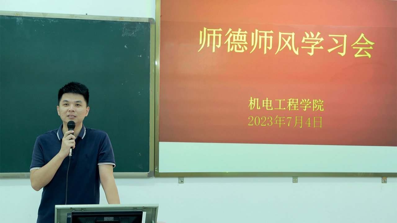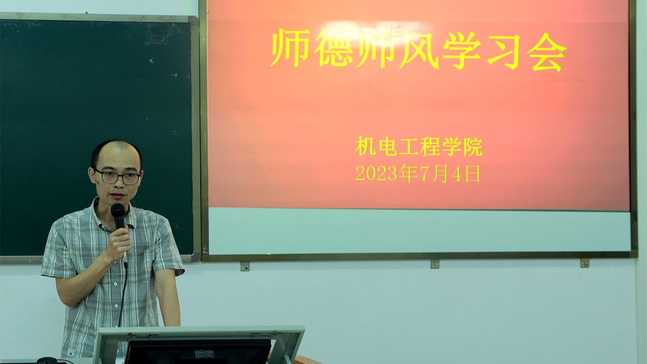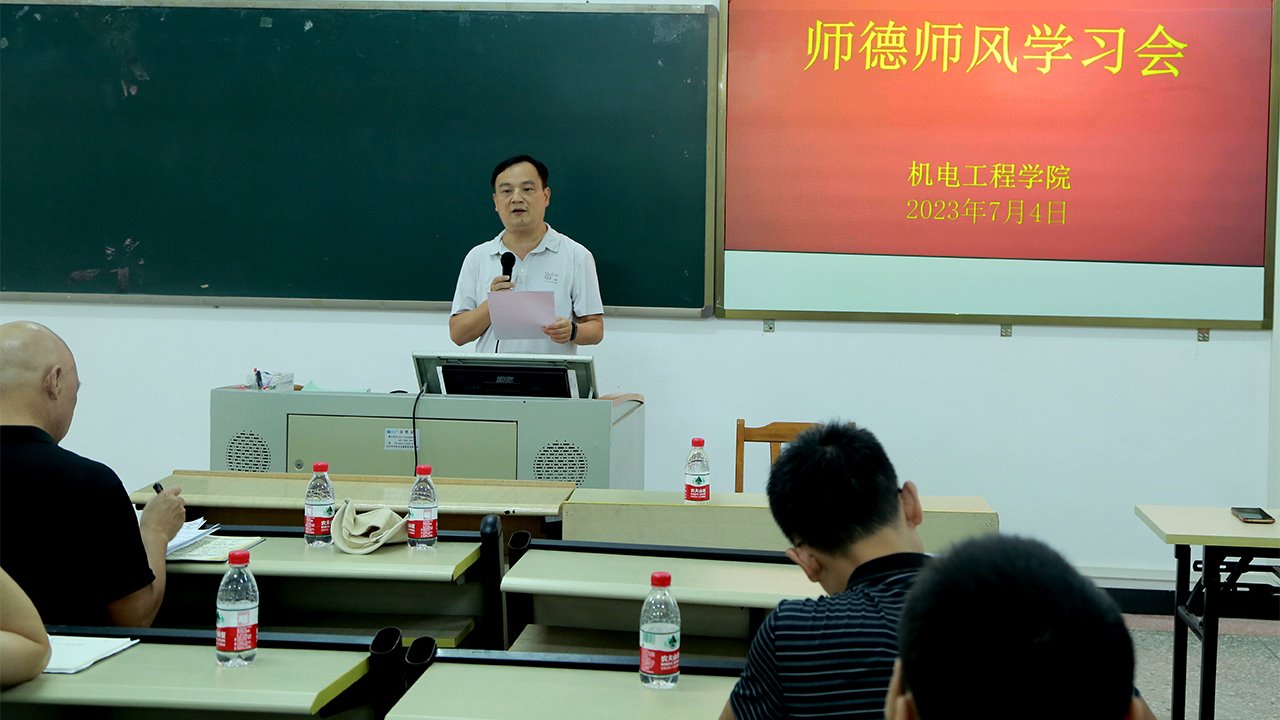 为深入开展学习贯彻习近平新时代中国特色社会主义思想主题教育,进一步加强师德师风建设,提高教师的职业道德素养,7月4日下午,机电工程学院党总支召开师德师风专题学习会议。学习会由学院党总支书记钟建坤主持,学校党委副书记叶国英及学院全体教职工参加。