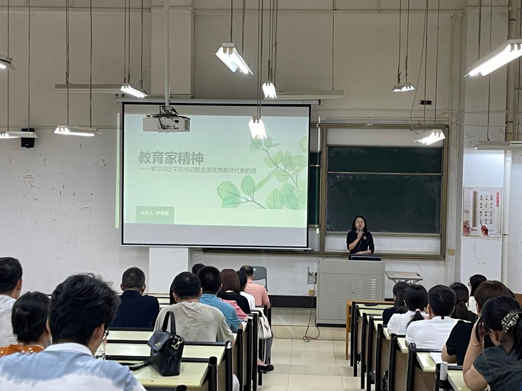 首先,罗春娜院长带领全体教职工学习了《习近平致全国优秀教师代表的信》。罗春娜院长从教育家的角色、教育家的使命、教育家的品质、教育家的教育理念以及教育家的教育实践等五个方面阐述了教育家的精神内涵,希望学院全体教职工以习近平总书记信中提的“躬耕教坛 强国有我”教育家精神为指导,立足本职岗位,牢记为党育人、为国育才的初心使命,做教育事业的笃行者。