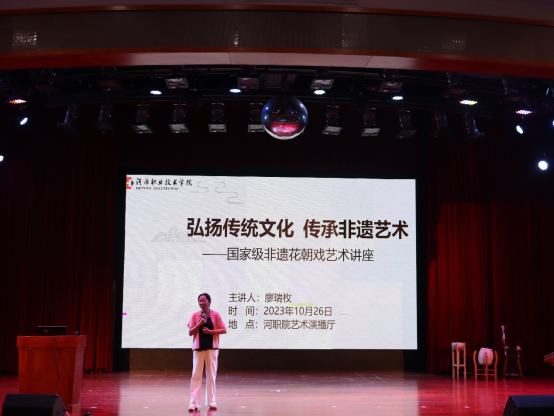 为了让学生更好地了解非遗文化花朝戏,我校美育中心于10月26日晚在艺术楼演播厅开展了国家级非遗花朝戏艺术讲座。本次讲座由紫金花朝戏传承发展中心的廖瑞枚老师主讲,老隆师范学院300名学生代表参加了此次讲座。