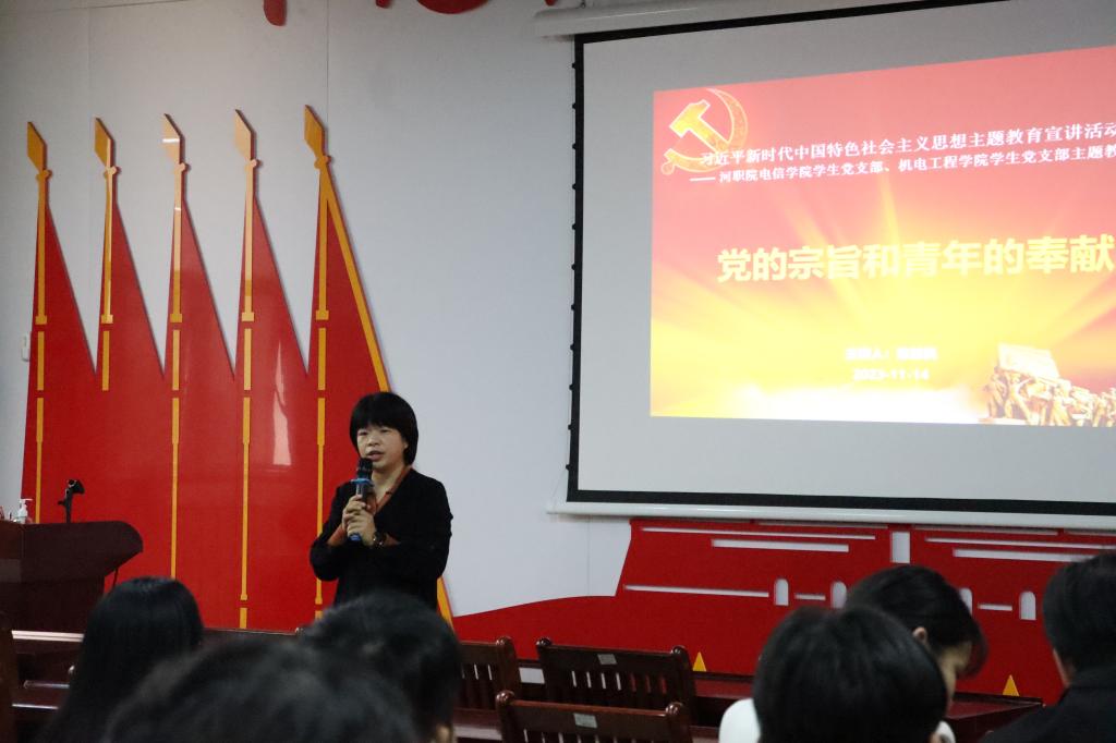 为抓实抓细学生党员主题教育,加强学生党员的思想建设和对党的深入学习了解,电信学院学生党支部于11月14日下午在实训楼B306开展了“以党的宗旨和青年的奉献”为主题的专题党课讲座,由学校“学习贯彻习近平新时代中国特色社会主义思想主题教育宣讲团”成员陈慧枫副教授主讲。