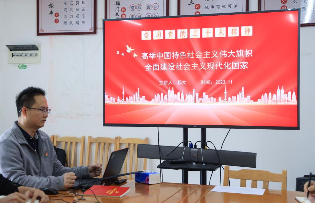 杨文同志分别从主题结构、成就变革、精神境界、使命任务、战略安排五个方面全面系统深入的讲解了党的二十大精神内容。深入阐述了大会主题是举什么旗、走什么路、什么样的精神状态、什么样的目标,要求支部全体党员做到三个务必,同时从15个部分对“全面建设社会主义现代化国家进行全面部署”进行系统分析。从党的成立100周年、中国特色社会主义进入新时代和脱贫攻坚三个方面对党的成就变革进行了阐述。分析了中国共产党为什么能,中国特色社会主义为什么好,归根到底是马克思主义行。强调学习习近平新时代中国特色社会主义思想的世界观和方法论,务必做到6个必须坚持。党的中心任务就是团结带领全国各族人民全面建成社会主义现代化强国实现第二个百年奋斗目标,以中国式现代化全面推进中华民族伟大复兴。要求支部全体党员必须牢记五个必由之路。同时结合部门的全光网建设项目和其他信息化项目深入分析高质量发展的战略安排,即通过教育、科技和人才作为基础,全面提升我国高质量发展。要求全体党员做有理想、敢担当、能吃苦、肯奋斗的新时代下的合格党员。