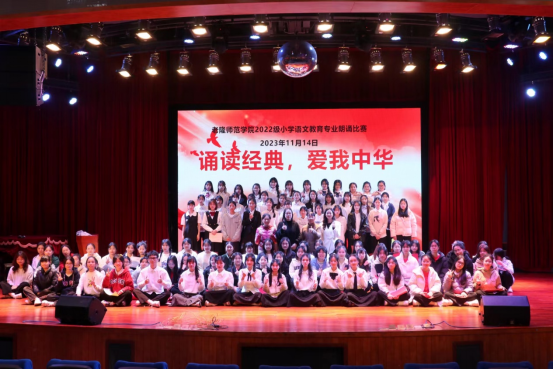 为弘扬爱国主义精神,传承红色基因,提升教师人文素养,老隆师范学院小学语文教育专业于2023年11月14日晚上在演播厅举办了一场“诵读经典,爱我中华”主题朗诵比赛。出席本次朗诵比赛的有小学语文教育老师及22小学语文教育的全体同学。