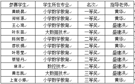 我校学生首次参赛,在各参赛学生和指导老师的精心准备及共同努力下,小学数学教育、大数据技术、数控技术三个专业的11名参赛学生全部获奖,其中获一等奖4人、二等奖5人、三等奖2人。