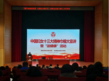 12月18日上午,由河源市妇联、星空在线(中国)唯一官方网站主办,工商管理学院承办的“跟党奋进新征程 巾帼建功新时代”——中国妇女十三大精神巾帼大宣讲暨“送健康”活动在图书馆报告厅举行。河源市妇联宣传干部叶芷欣,二十大党代表、中国妇女十三大代表、龙川威达绝缘材料有限公司党支部书记、工会主席、妇联主席黄东云,中国妇女十三大代表、东源县漳溪畲族乡党委副书记、乡长蓝伟先,青少年心理健康知识讲师、主任记者、国家二级心理咨询师、国家中级社工师、高级感统培训师余智红,河源市委党校党员教育师资库优秀讲师、河源市点创融湾文化服务有限公司党支部委员会书记陈浩山,工商管理学院团委书记李志宇、校企办主任曾惠华,以及300多名女学生代表参加活动。