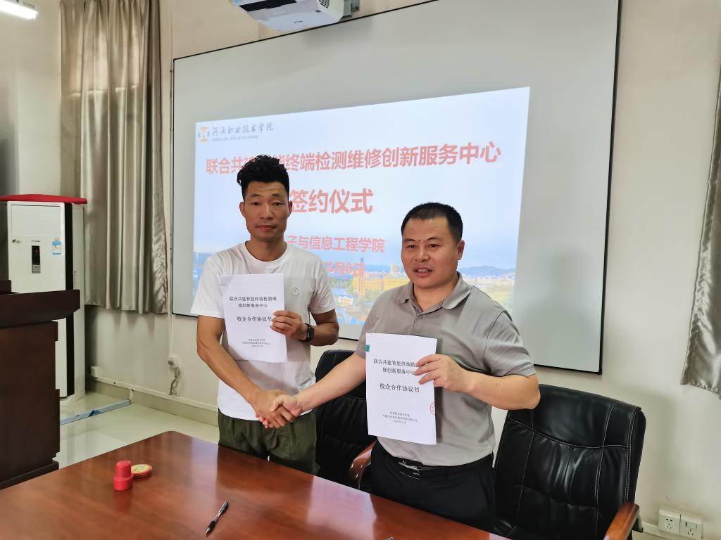 2024年5月8上午,电信学院与河源市美胜达通讯科技有限公司在实训楼B307举行校企合作联合共建“智能终端检测维修创新服务中心”校企合作签约仪式。河源市美胜达通讯科技有限公司总经理黄美胜、电信学院周永福副院长及相关专业教师代表出席了本次签约仪式。