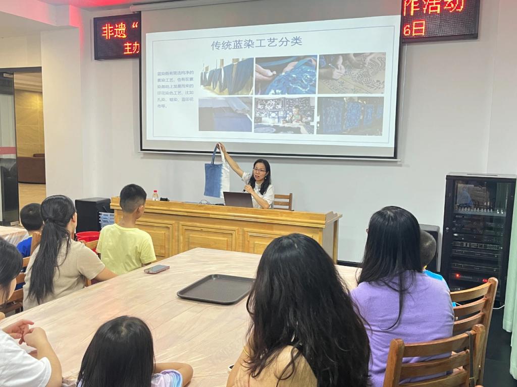 黄秀丽教授以通俗易懂的表达方式开展理论教学,讲授了墩头蓝布艺蓝染的文化背景、独特工艺及其制作流程,介绍了此次布艺蓝染实践的实操步骤和注意事项。在实践教学中,学员学习准备材料、浸泡布料、控制染色和氧化过程,最终每个人都成功制作出独特的蓝染手工艺品。理论与实践教学让学员对墩头蓝布艺蓝染有了更加全面和深入的认识和了解。
