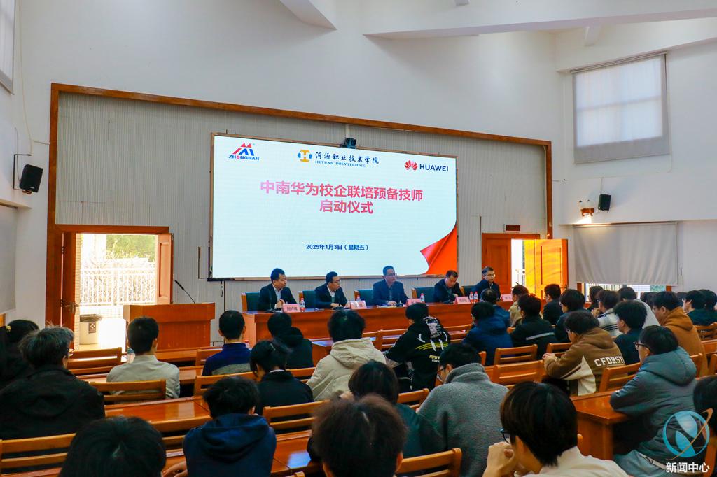 1月3日,我校在行政楼C108举行中南华为校企联培预备技师班开班仪式。华为机器有限公司人力资源高级经理王凯、维修技术高级经理丁山花,中南国际科技发展(深圳)有限公司华为项目经理刘科城、校企联培负责人黄菲,我校教务处处长杨文,电子与信息工程学院党委书记周永福、副书记周文,电子与信息工程学院校企办主任叶红卫,电子与信息工程学院相关专业教师及学生代表。活动由周永福书记主持。