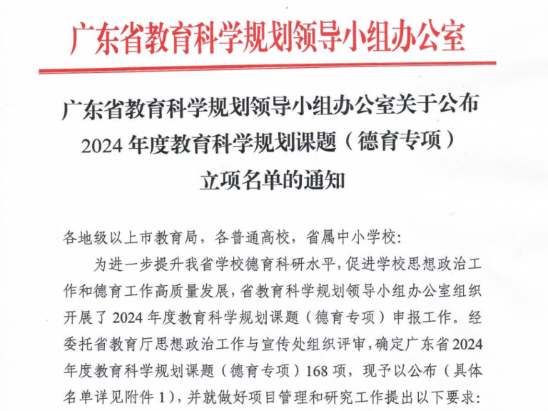 近日,2024年度教育科学规划课题(德育专项)和广东省高校思想政治教育课题立项名单相继公布,我院教师在此次课题申报中表现突出,共立项省级课题4项。其中,杨婷老师主持的课题《教育数字化时代中华优秀传统文化融入高校思想政治教育的路径研究》成功获批2024年度教育科学规划课题(德育专项)立项,同时,徐微、张伟东、郭慕卿三位老师分别主持的课题也成功获批2024年度广东省高校思想政治教育课题立项。