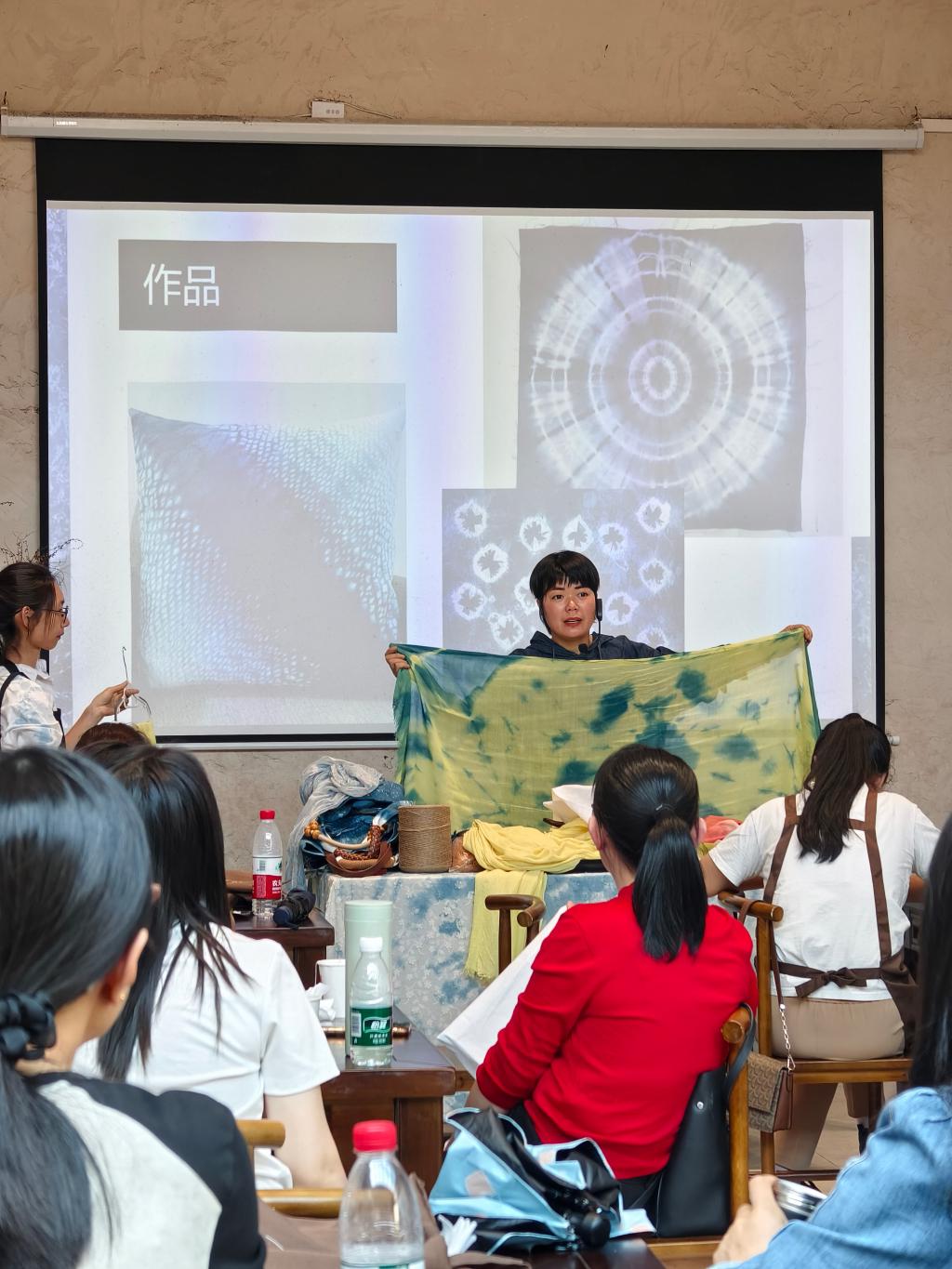 欣赏完古村的秀丽风景后,女教职工们还一起参与了非遗艺术——扎染体验活动。扎染老师为女教职工们详细介绍了这一古老技艺的历史渊源、制作流程和文化内涵。扎染作为中国传统的手工染色工艺,历经千年岁月,饱含着先辈们的智慧,每一道工序都凝聚着独特的文化魅力。理论知识讲解结束后,便进入了实践环节。现场准备了丰富的工具与材料,女教职工们充分发挥创造力,从折叠布料,到运用捆扎、缝绞等不同技法,将布料塑造出独特的形状,随后浸入染料之中。在等待染色的过程中,大家交流着彼此的创作思路,现场氛围热烈。