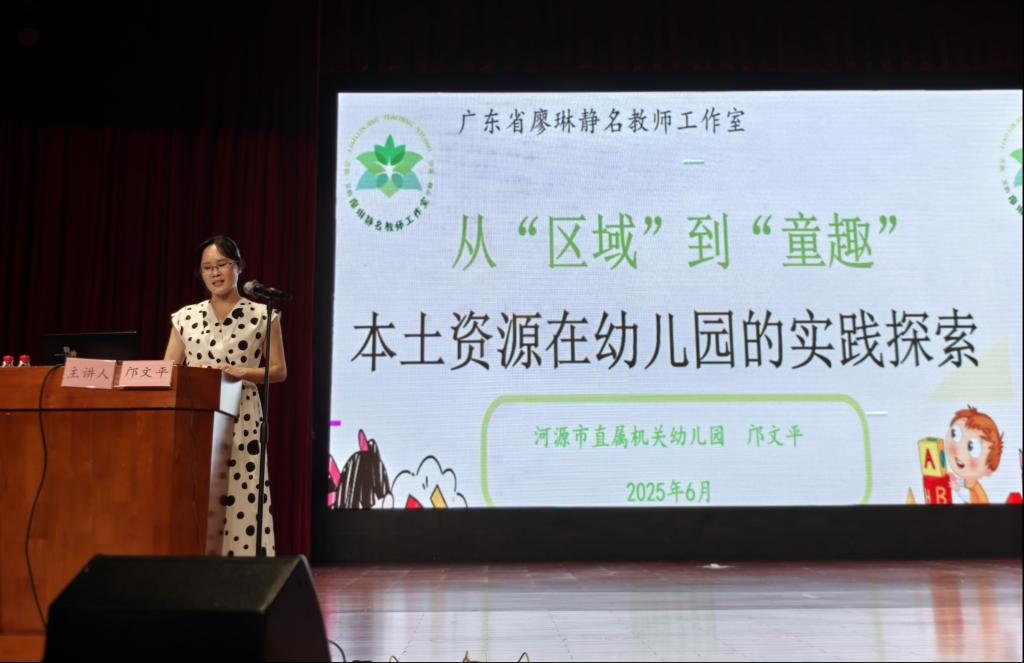 首场讲座聚焦“幼儿园区域活动指导与本土资源应用”。河源市骨干教师、河源市直属机关幼儿园语言科组组长邝文平老师以河源丰富的自然与人文资源(如客家文化、生态景观)为切入点,深入剖析如何巧妙挖掘、转化本土资源,创设富有教育价值与文化底蕴的区域游戏环境。通过生动的案例分享,引导学生理解如何在游戏中激发幼儿探究兴趣,促进其认知与社会性发展。