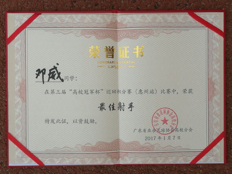 最佳射手邓威奖状