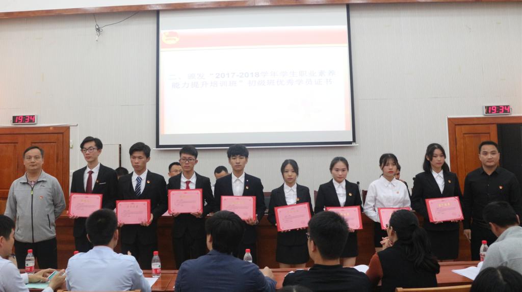 主持人杨成书记对初级班的学习效果和取得的成绩进行总结,钟建坤院长和陈剑辉总经理为荣获“2017-2018学年学生职业素养能力提升培训班”初级班优秀学员代表颁发证书,杨淇同学作为初级班优秀学员代表发言。