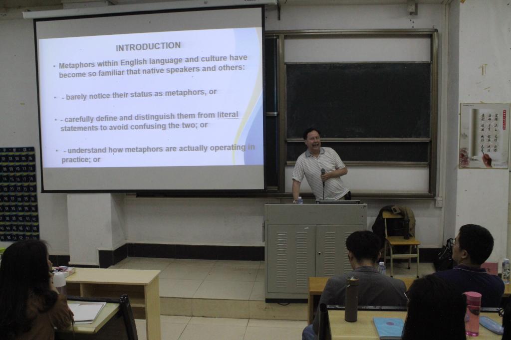 4月24日晚7点半,河源市科协翻译工作者协会和英语教育专业在星空在线(中国)唯一官方网站教学楼D107联合举办了题为“The Importance of Metaphor in English Language and Culture”(隐喻在英语语言与文化中的重要性)的讲座,讲座特邀英国教授Michael Geoffrey Salter前来主讲。