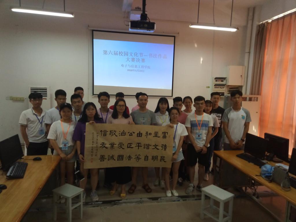 为了促进学生文艺创作的发展,提高学生文化修养。2018年5月22日下午,电信学院在实训楼A213举行第六届校园文化节书法比赛决赛。参加本次比赛的有评委老师、各专业班级的学生、学生会主席团成员,由团总支宣传部部长叶岳华同学主持。