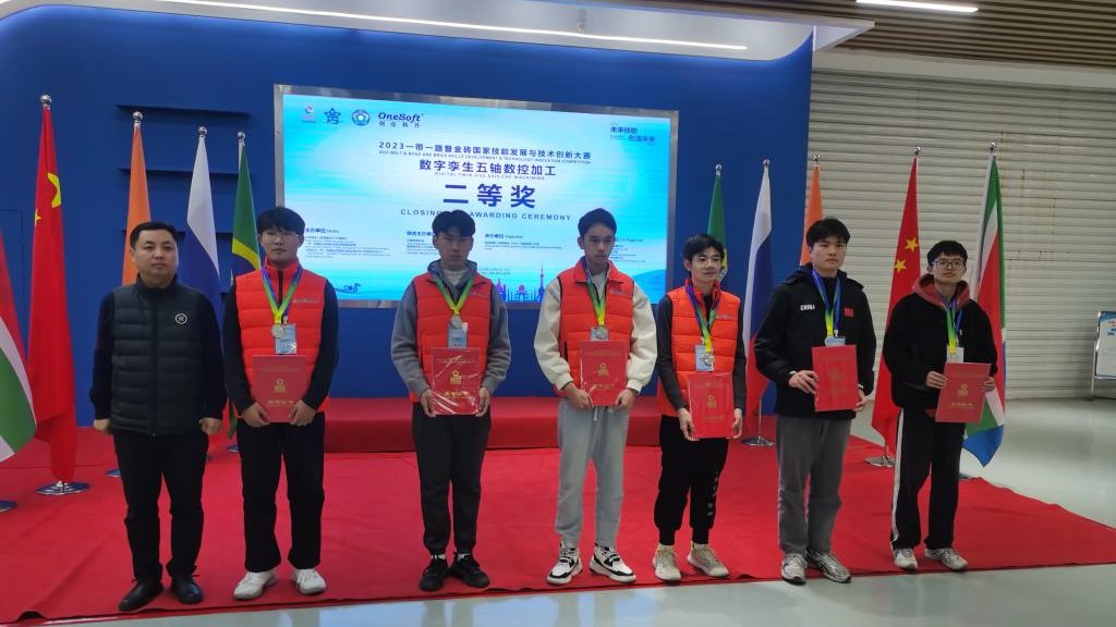 参加完2023-2024年度机械行业职业教育技能大赛“CAXA数码大方杯”工业数字化关键技术应用赛项后,我校师生又马不停蹄赶赴河北邢台参加2023年一带一路暨金砖国家技能发展与技术创新大赛数字孪生五轴数控加工赛项。该赛项于12月1日至3日在河北机电职业技术学院开赛,为个人赛,共有来自全国近四十支代表队参赛。数字孪生五轴数控加工是指利用五轴数控加工中心对工件进行金属切削加工的项目,以切削刀具去除材料方式来完成工件制作的过程。实际考核选手对五轴零件的读图、建模、数控程序编写、零件加工、检测等工作所需要的技术技能掌握的程度。我校派出邓登建、邝文钦两位同学参加了比赛,经过激烈的角逐,最终两人分获全国二等奖,叶增良、吕辉获得优秀指导教师,我校获得最佳组织奖。
